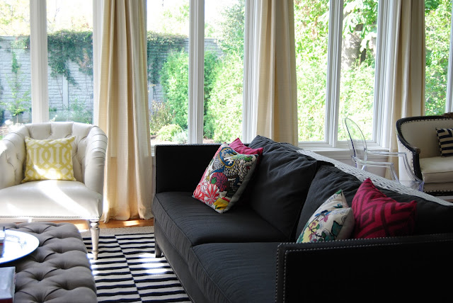 6. One Manuel Canovas Misia lumbar pillow (fabric on front, yellow and white dots on back)…