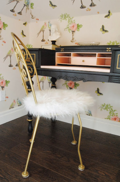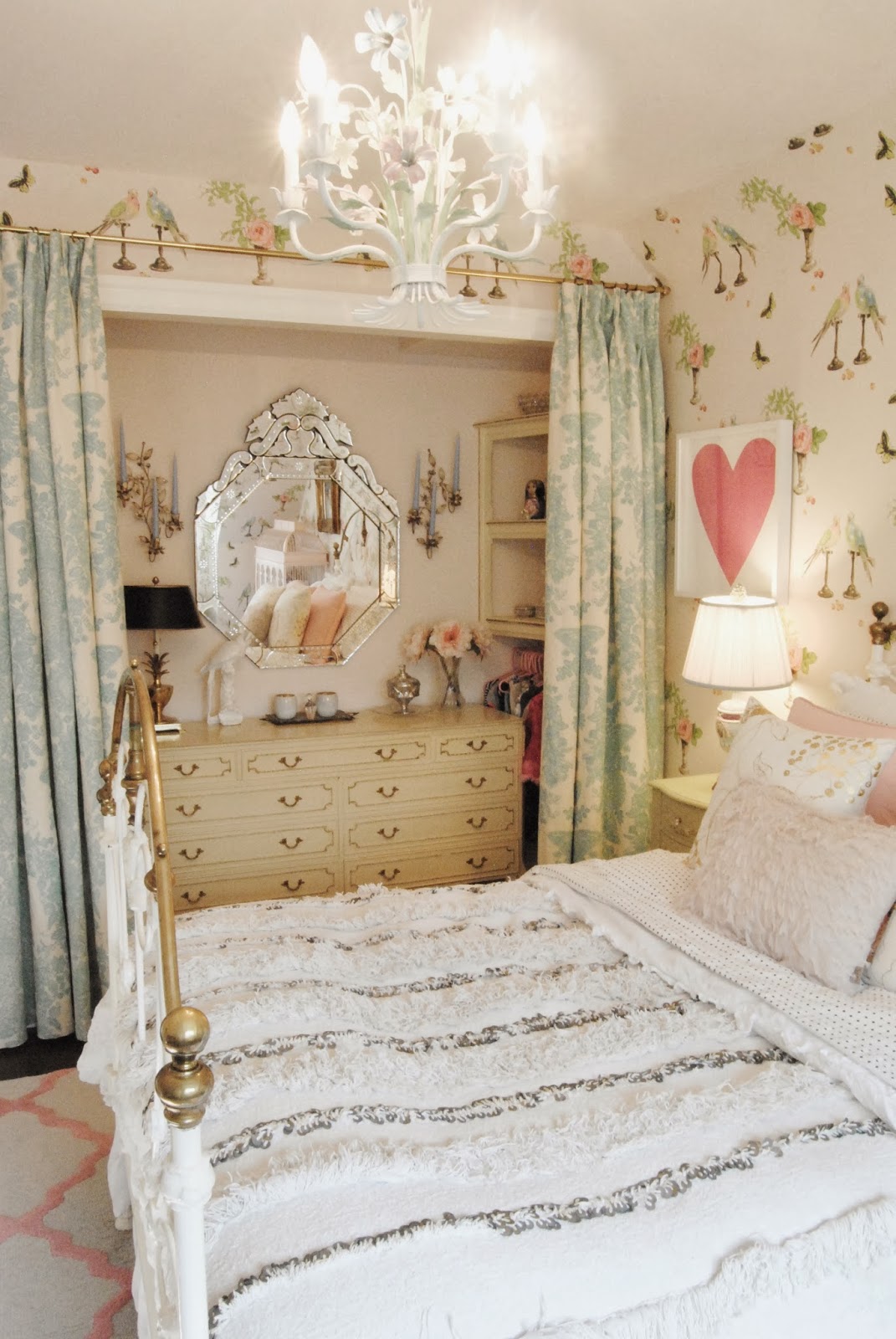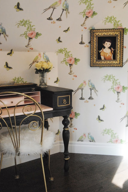 Posted at 10:19h, 18 NovemberSo beautiful, all of it! The wallpaper is A.MAAAAZING and it pulls it all together. Mirror, dresser, desk, wowza! Lovely little girls room!
