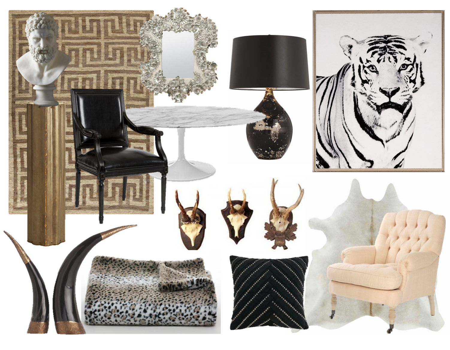 Cozy up your floor for fall with this tribal jute rug. Use this brass fluted pedestal to display your favourite poseidon bust. Admire all of your new BR pretties while sitting in this black leather french chair, that’s PS, ON SALE FOR 40% OFF (I’m ordering two of them:)! And speaking of sale items and chairs, you might aso want to add in this blush silk tufted chair that’s also close to half its regular price!!! Set this marble tulip coffee table on top of your new cowhide rug, which will keep your toes nice and warm on those colder autumn nights…as will this luxurious linx throw and studded black pillow for that matter. Use this black on black table lamp to keep your room all nicely a glow as the days get shorter and enjoy the natural reflective quality of this jewel shell mirror as well. To finish off your fall inspired space, add in a little animal inspired art/accessories a la acrylic tiger print, brass black horns, and