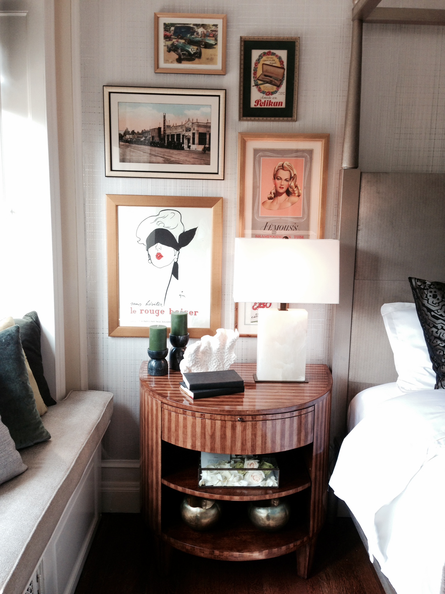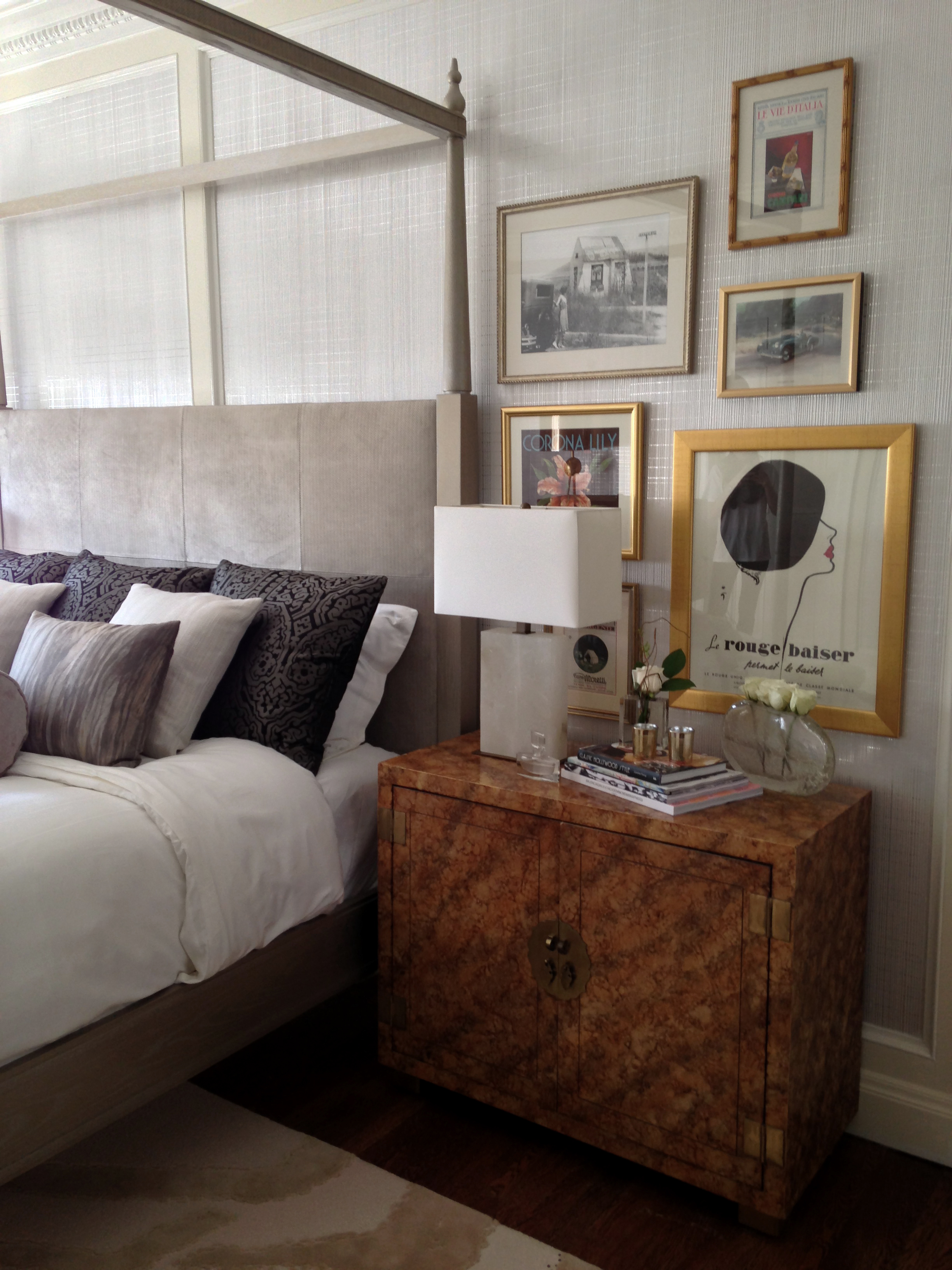 All of the framed prints above the nightstands are mainly vintage advertisements including a pair of Original Rene Gruau Illustrations - The Red Kiss, advertisement for smudge proof lipstick from the 50’s, Gruau was a famous French fashion illustrator for Christian Dior.”