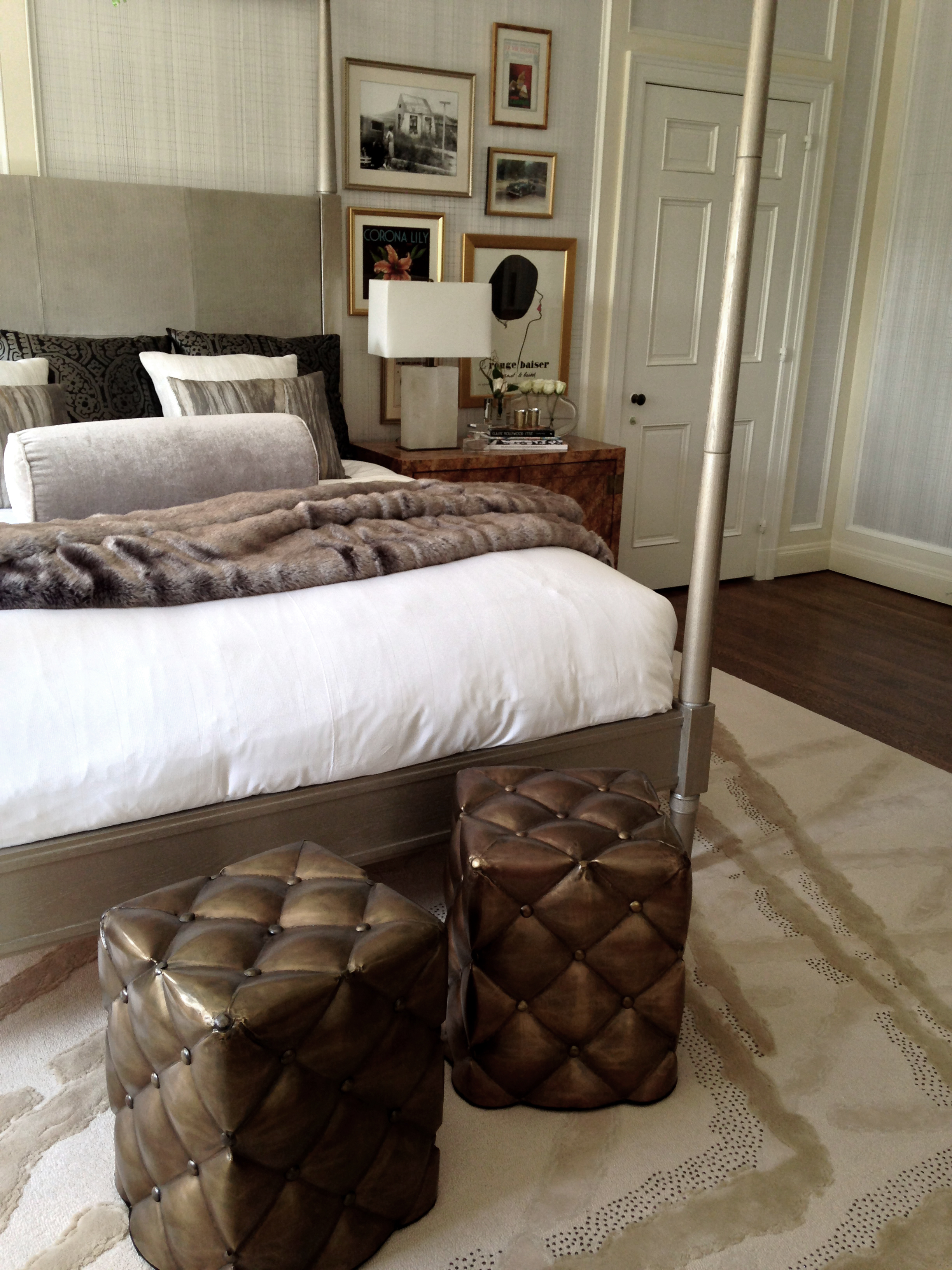 There is chrome, brass, and bronze in the space. The “tufted” ottomans in front of the bed are actually bronze metal.