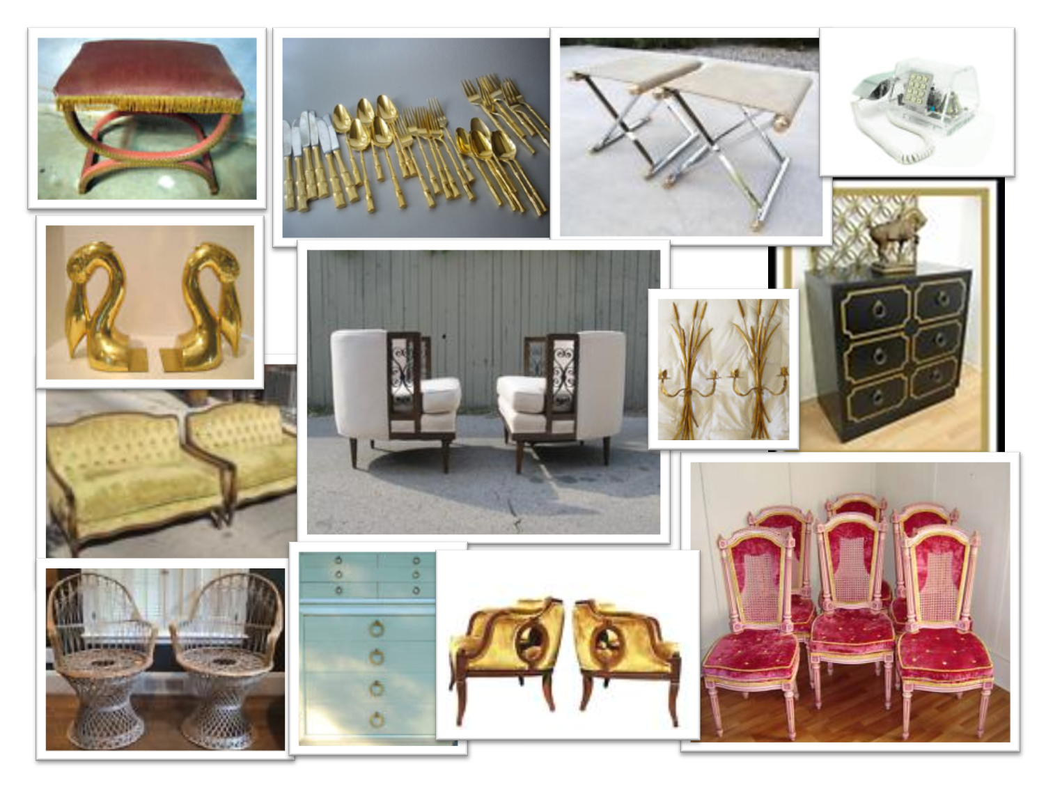 Am I totally nuts for wanting those pink velvet dining chairs? I adore the white chairs in the center with the scroll woodwork and the chrome x-stools might just have to come home with me. I also have my eye on that set of gold faux bamboo cutlery- quite lovely. The 80s clear phone rocks and I would love to rip the tassel off of that divine pink bench- it would look super in my master bath with some towels resting comfortably on top. Let me know if anything tickles your fancy and I will forward the link.