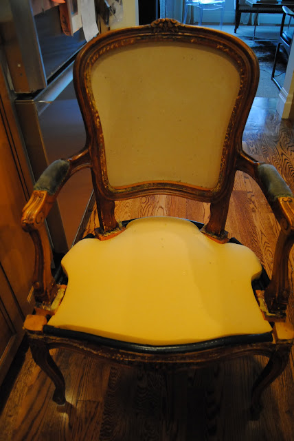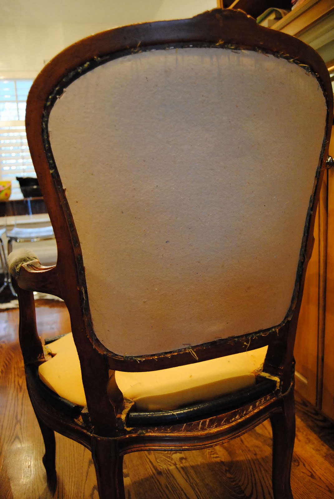 And now in words- We started by taking out the nail heads with a flathead screwdriver (hubby’s job.) The first surprise was that the nail heads weren’t actually nail heads but one long string of round metal buttons. As soon as we pried them away from the chair, they bent and broke into pieces and were therefore, garbage. Next, I started on the staples using a pair of pliers- most every staple broke and I ended up having to take both halves out by levering the wrench against the chair; this resulted in many gouges in the wood and me cursing. As I started taking off the fabric, the foam actually started to crumble away so even though I was led to believe they were newly reupholstered, no such luck. So now, I also have to replace the foam- sounds easy enough but there are no foam stores open here until Monday, so me not happy. I decided to head up to Michaels and see if they had anything that could substitute and paid $30 for some quilt batting that the lady said would work- great. So, at the end of day one, we have one chair totally ripped apart, no real foam, and totally hacked up wood. This leads to the dilemma. I had intended to leave the wood as it is but no such luck on that deal so my two options are to either go gold or flat black- thoughts? I also am trying to decide if this whole thing is worth it or if I should just haul the two sad chairs over to our upholsterer, pay the $400 and get them done properly. To be honest, I am heavily leaning towards plan B. If, on top of wrecking the wood, I mess up my gorgeous fabric, I will honestly loose my mind. Sorry for the long boring rendition of the days events but I’m at a bit of a loss here.