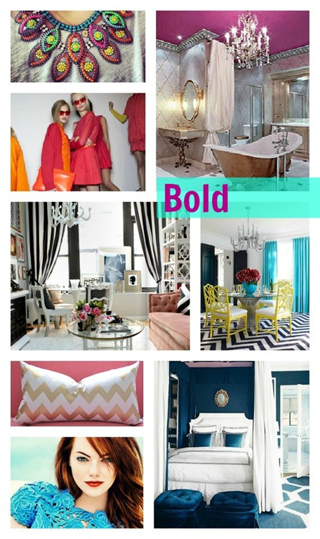 As much as I love a whimsical and soft style, I am drawn to a room or outfit that has a focal point. A bold look, to me, can be accomplished through bright colors, loud patterns, and a mix of textures. I admire anyone who is willing to use a bold style in their apparel or their interiors because it draws so much attention; however, you almost have to have a room or outfit that is close to flawless if you want that kind of attention. My favorite bold combinations are black and white stripes, a large chevron print, color blocking two opposite colors, and a bright-colored ceiling.