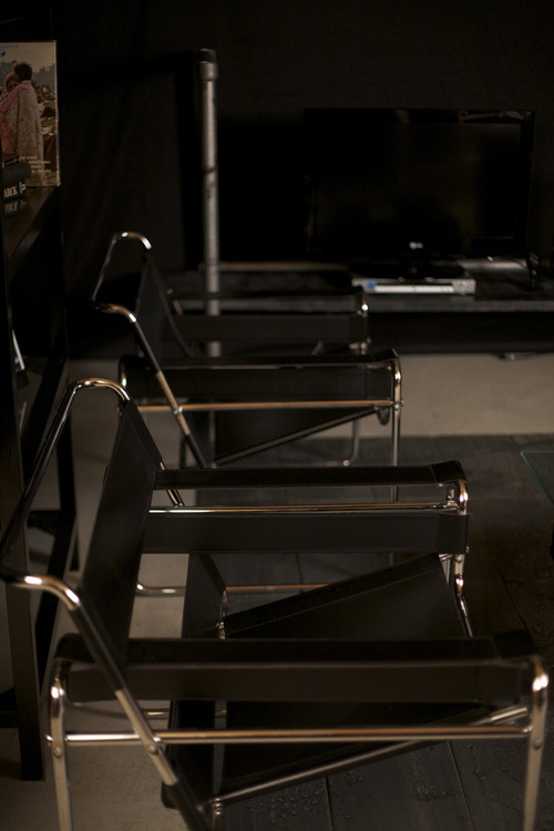 The first space is called the Unwind…black, metal…garage turned living room…sleek, edgy, cool.