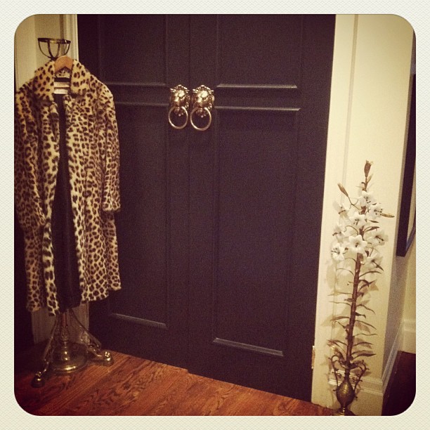 And in the hallway, this amazing candlestick, gold torch light (hiding behind my leopard coat), and spooky lady portrait are also from TC…