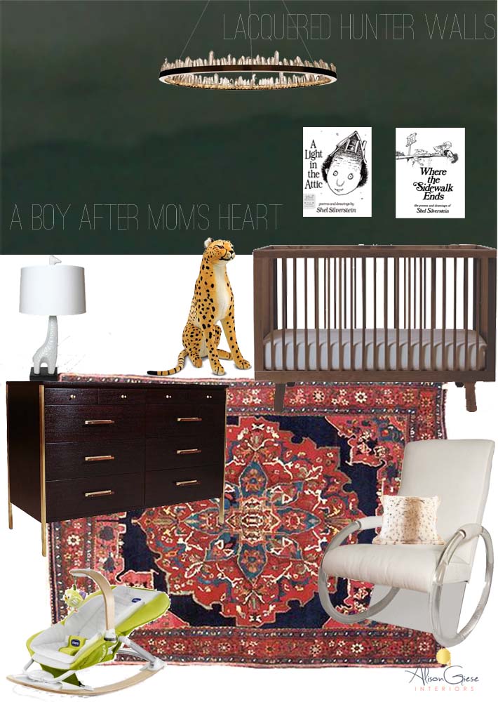 Hello! Alison from Alison Giese Interiors here. I have to admit, it was a tad intimidating to design a nursery for Lady Christine, or, should I say Master Bijou, as his Mum’s style meter is off the charts! I’ve only designed nurseries for baby girls, so this was an Über fun departure. I went for a good mix of trad and modern that is signature B&B, and threw in the kind of drama that would make this nursery a stand-out in its ‘hood.