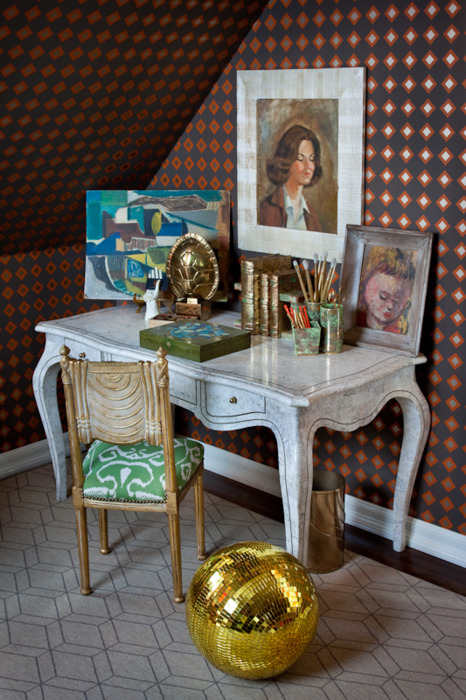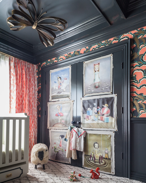 The illustrations on the closet doors are my fave element…I’m also pretty smitten with the dark walls/ceiling, huge Beni and that gold doll presentation table.