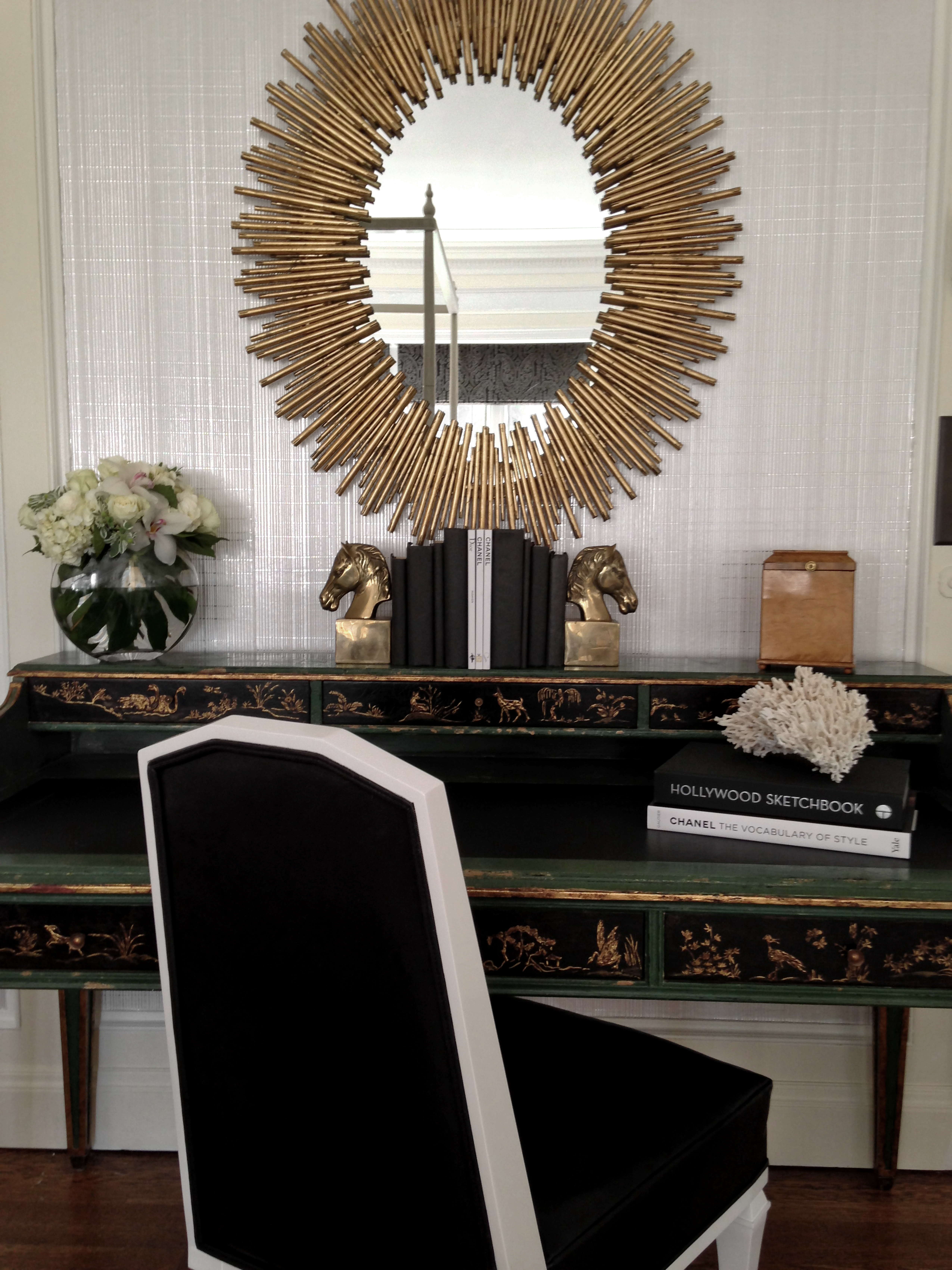 Desk & Desk Chair - paired the Rose Tarlow Louis XVI Desk in a green and tete de negre distressed chinoiserie finish (a traditional feeling piece) with a more modern Reagan Hayes Henry Chair in a glossy white paint finish and almost a black patent leather from Moore & Giles. The chair definitely modernizes the desk.