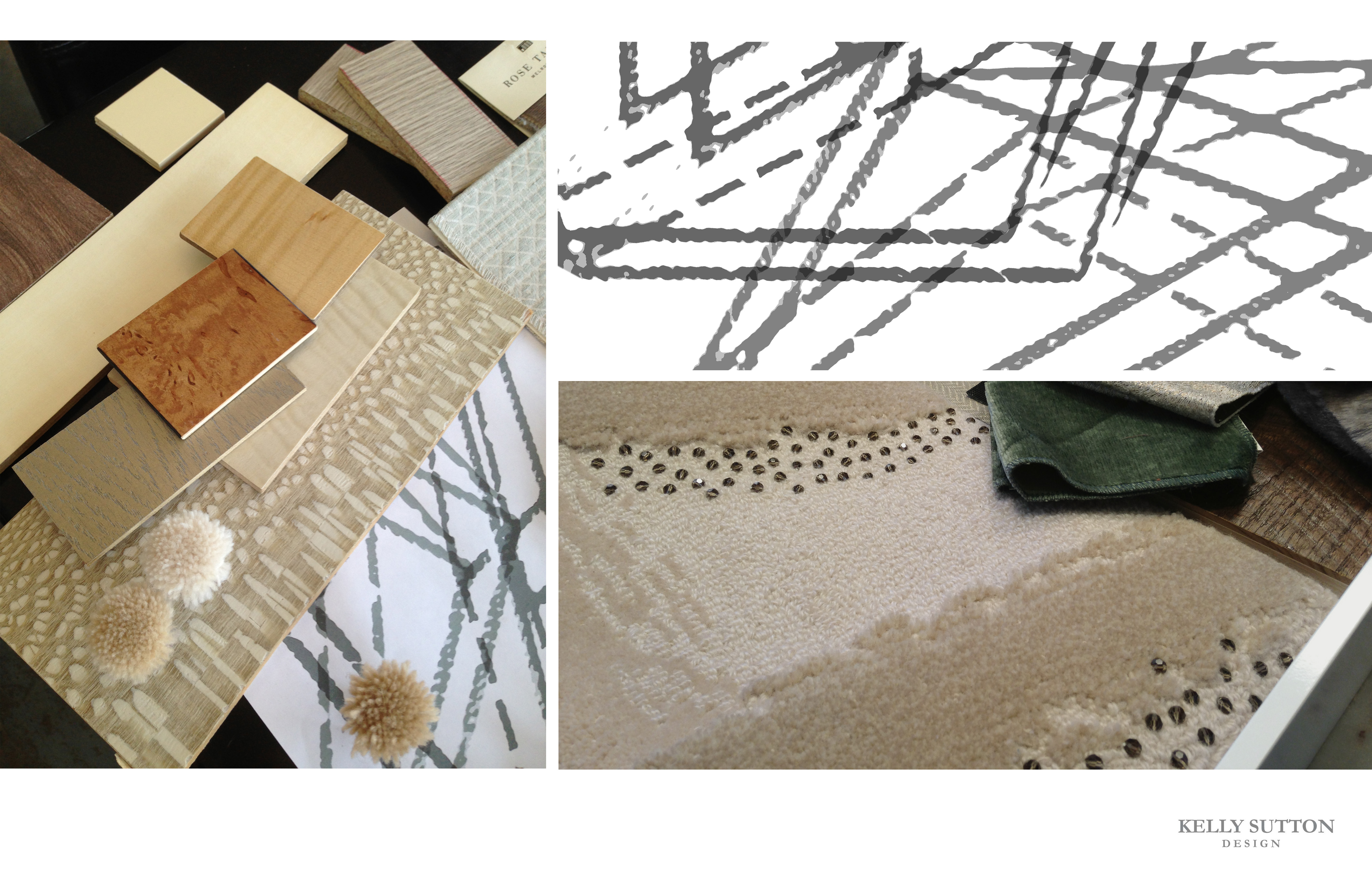 Rug - Completely custom design for the show. I designed the pattern based off the abstracted and layered facets of a crystal. We did the whole design very neutral and tone on tone but used raised cut yarns and looped yarns to give the rug a lot of dimension. We also had smoky colored Swarovski crystal sewn in as accents along the raised pattern. It is subtle glamour.