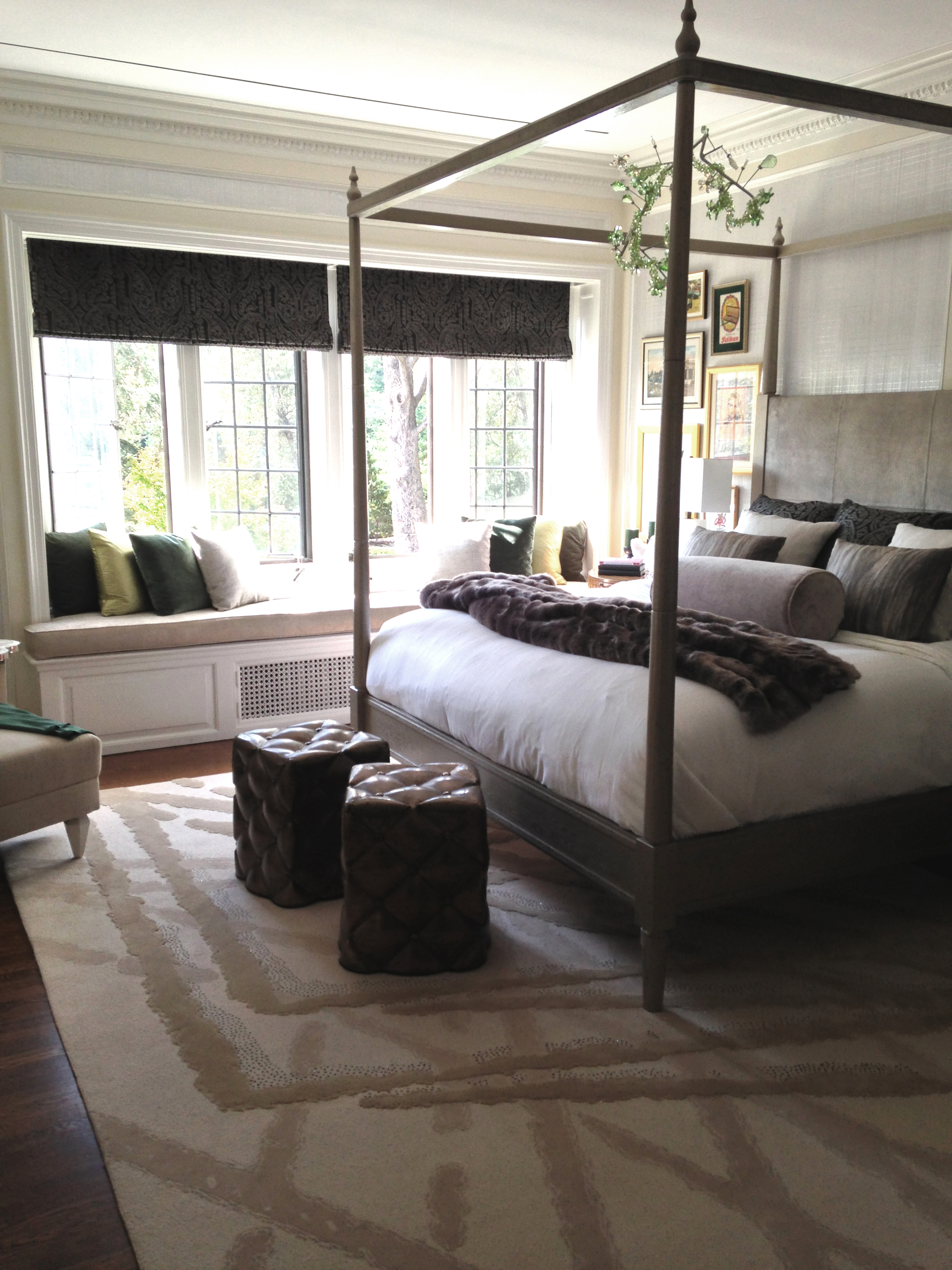There is chrome, brass, and bronze in the space. The “tufted” ottomans in front of the bed are actually bronze metal.