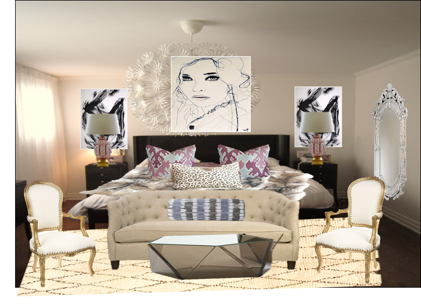 Included in the changes are: Kelly Wearstler Bengal Bazaar cushions, a fur blanket, Nicole Cohen tie-died roll, faced lucite table from Paris Apartment, 2 white french chairs, Beni rug, venetian mirror, blush mirano glass lamps and artwork from Leigh Viner.