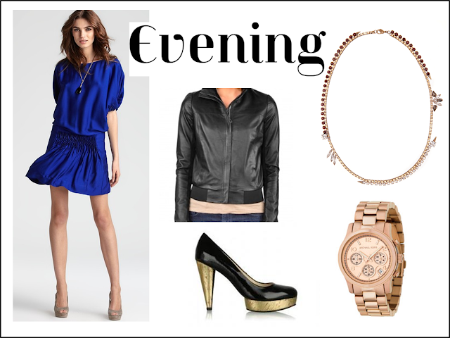 DVF Handy dress, Michael Kors patent/gold pumps, Michael Kors rosegold watch, Fallon necklace, Rudsak jacket.
