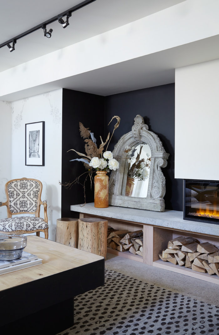 …fabric on Louis chair, Olea by Fabricut…again rug, Annie Selke, side tables Bouclair and amazing fireplace, Dimplex.
