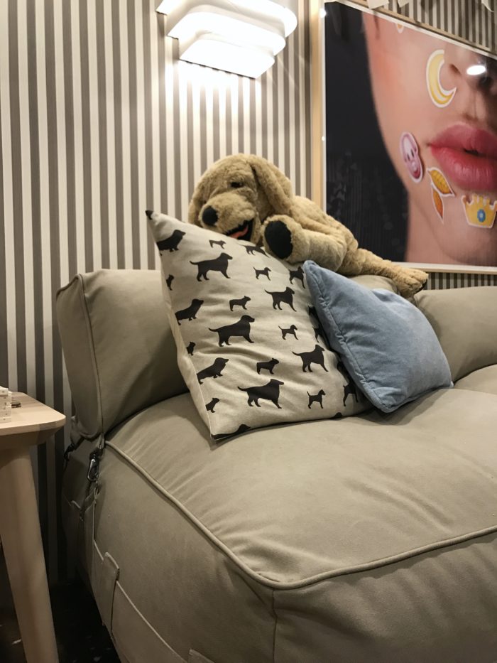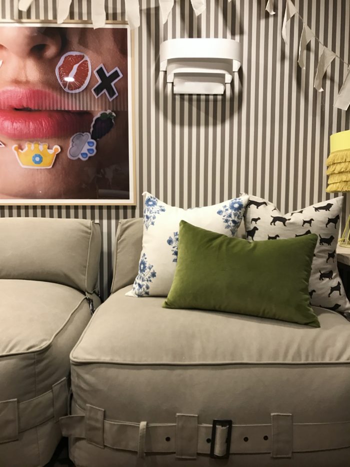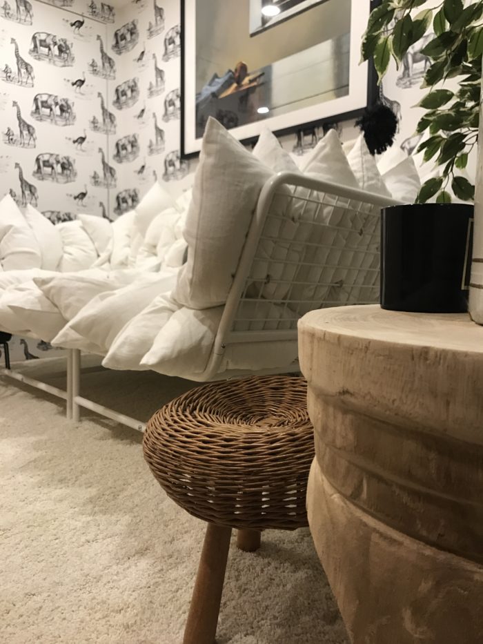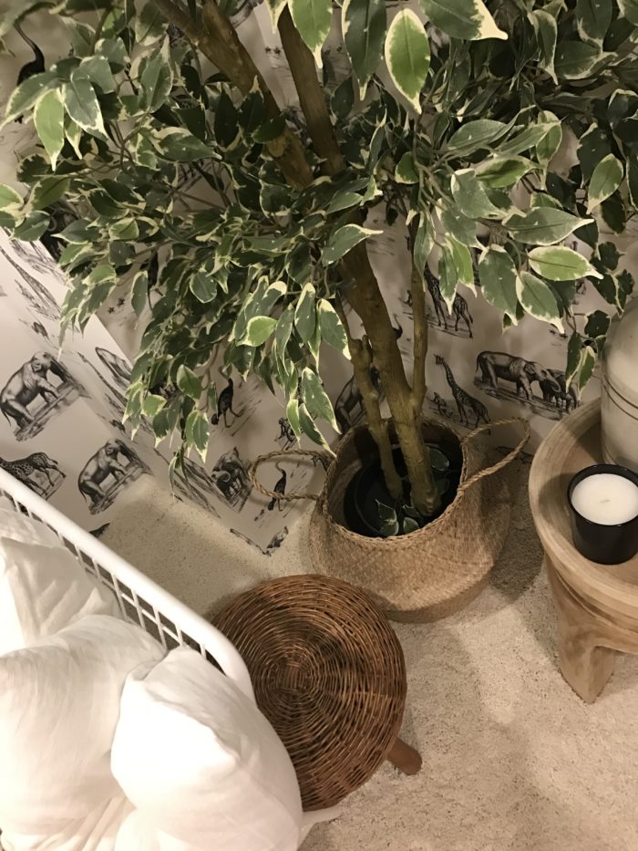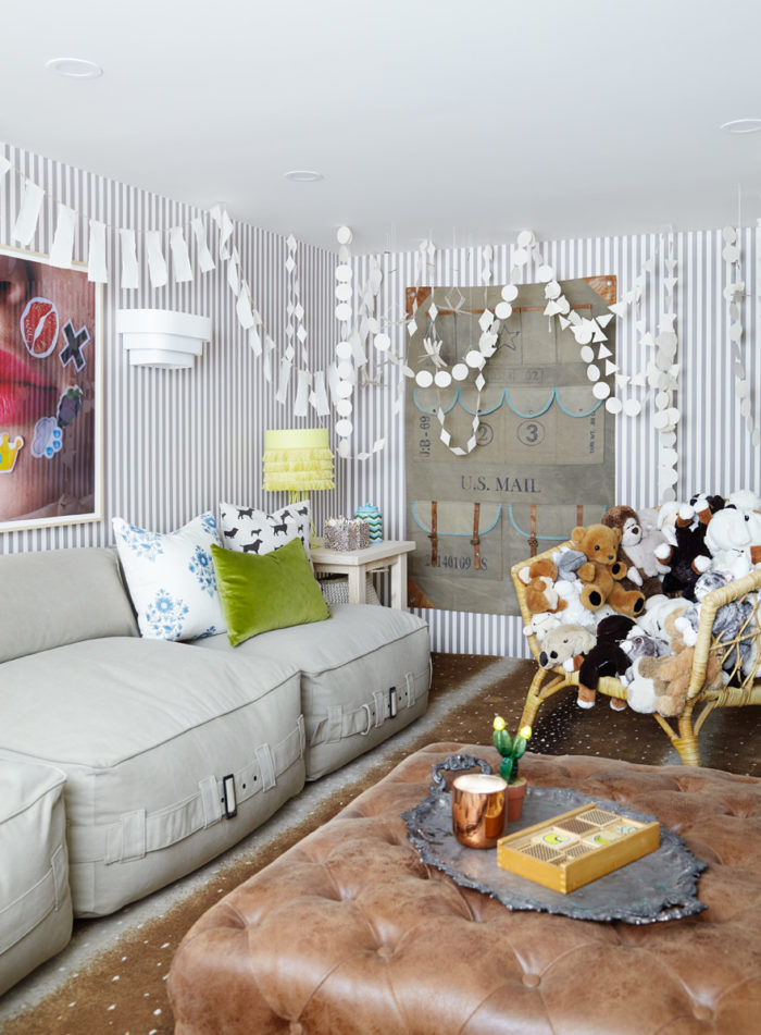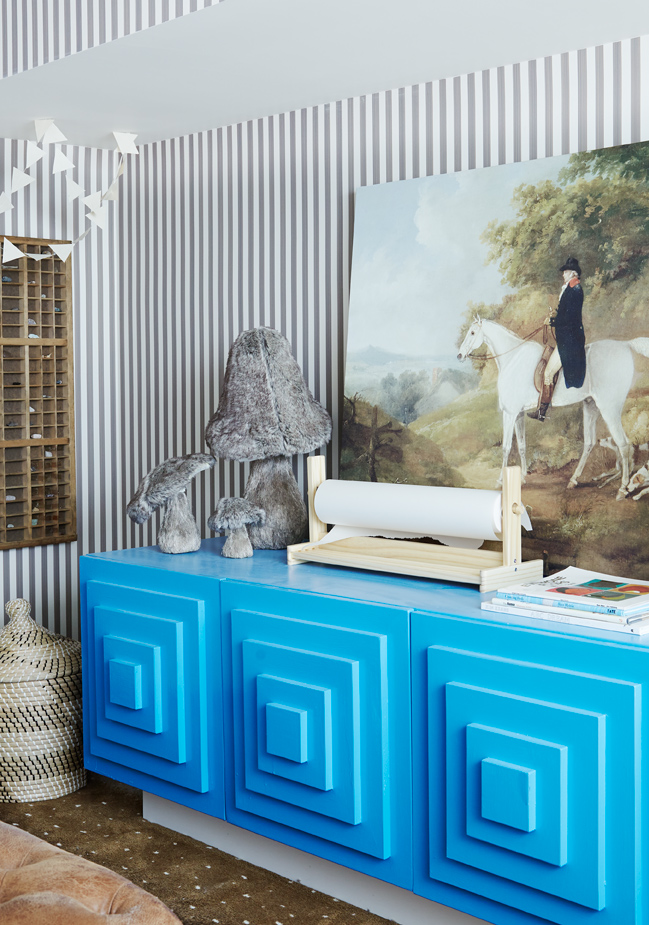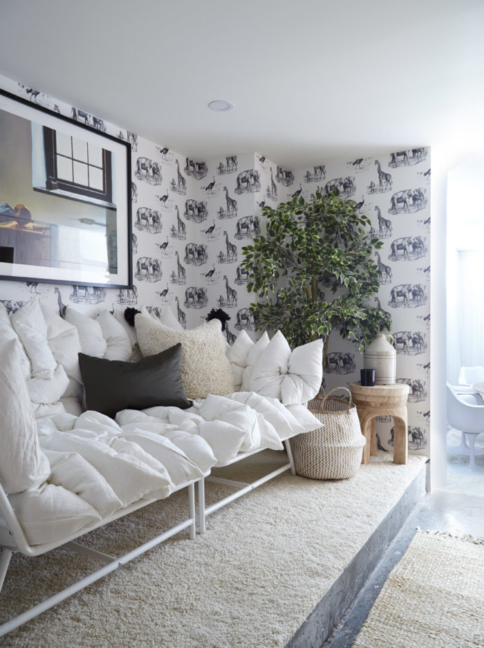 …Animal House Men in Black wallpaper is NewWall, carpet Karastan, wood side table and Justina Blakely pillow Candelabra, artwork Minted, sofa, large ‘Jassa’ reed bowl and plant IKEA Canada, trundle basket and magazine rack EQ3.