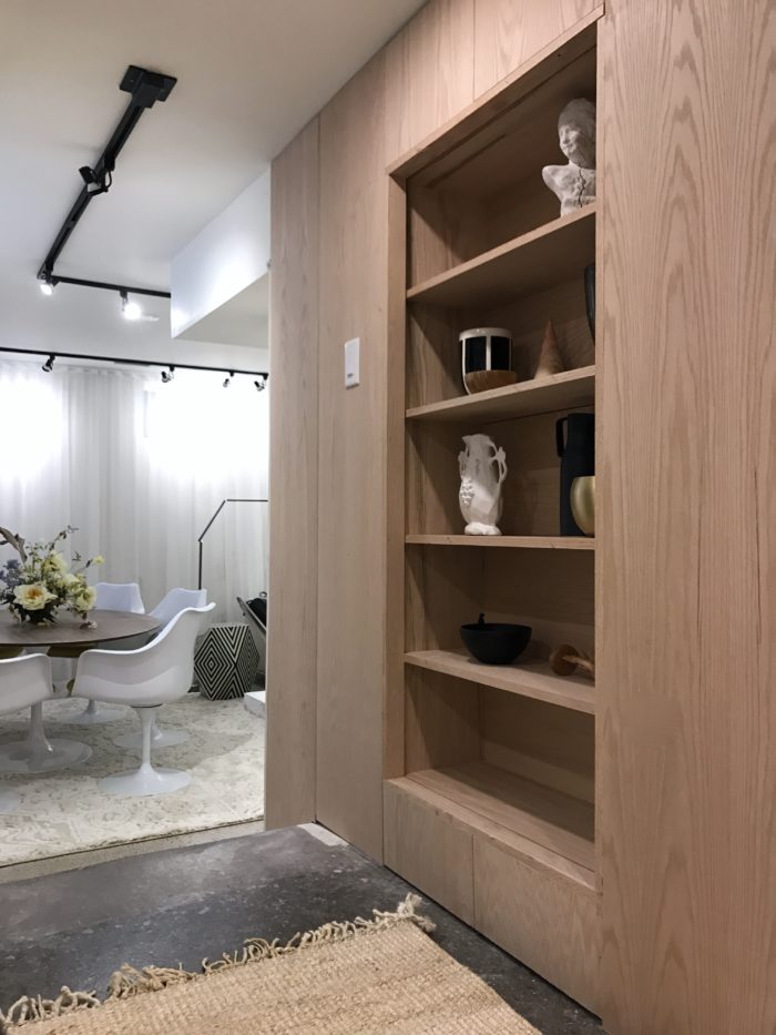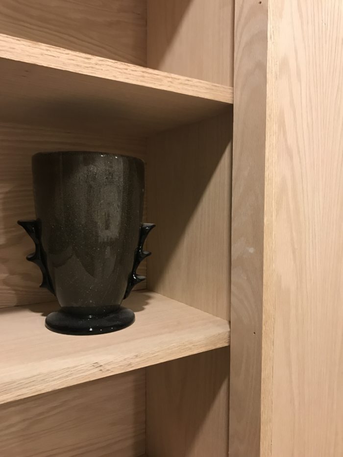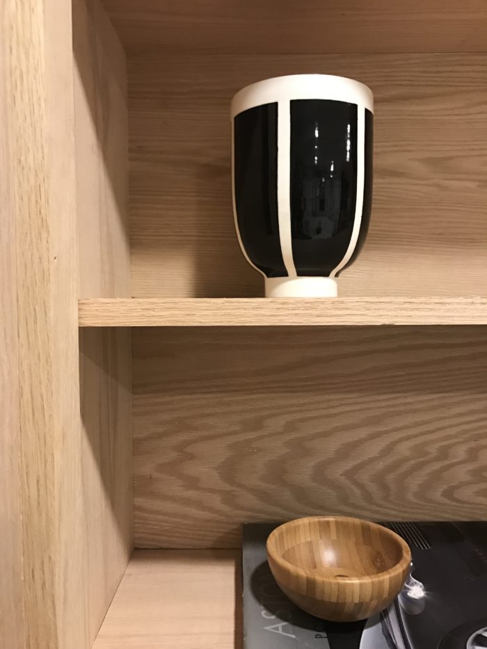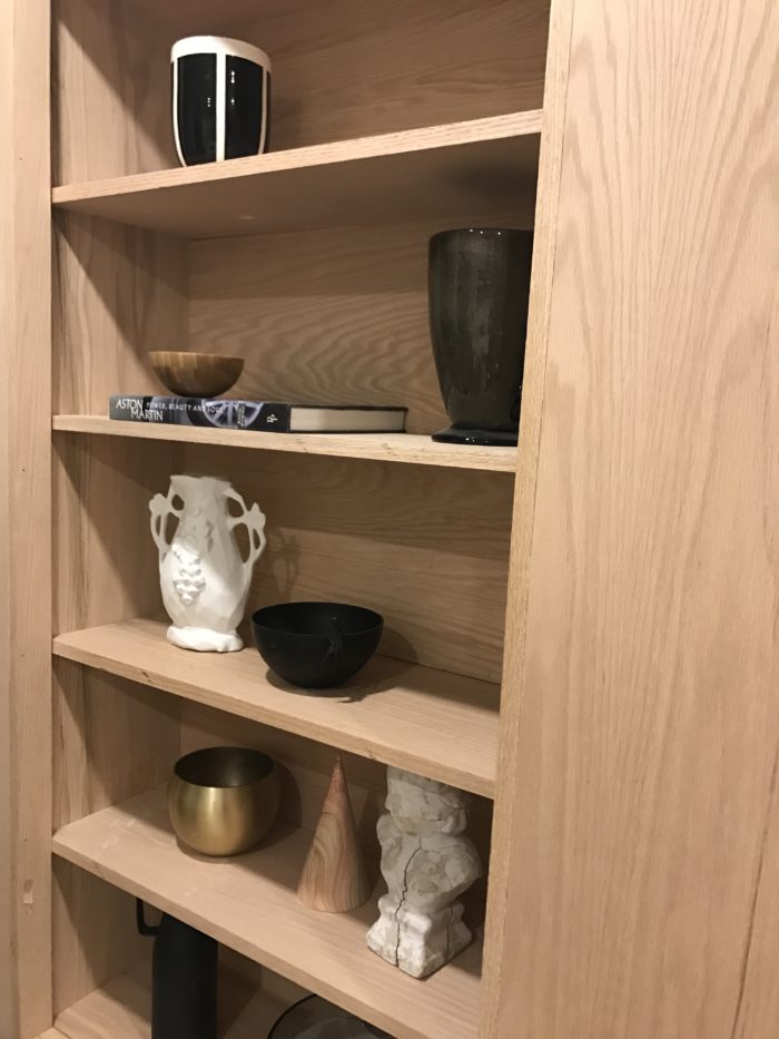 …oak veneer Home Depot Canada, oak shelving Metrie, black and white vase is Jill Rosenwald, black vase by Candelabra.