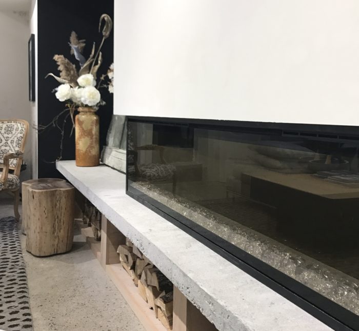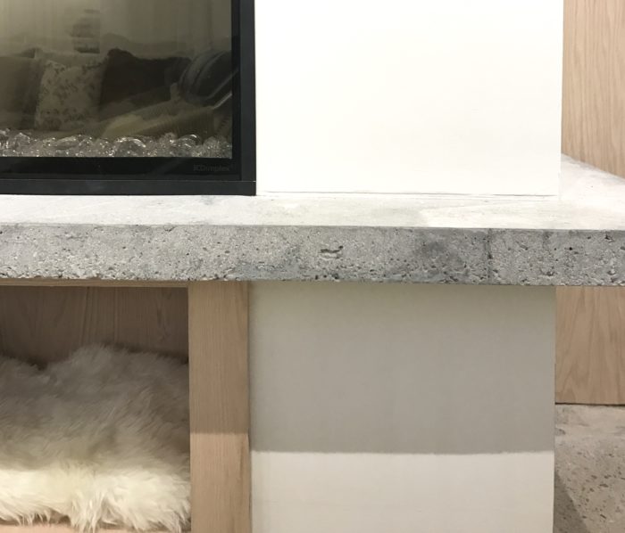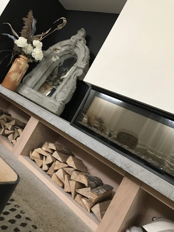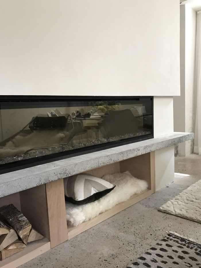 …my new stunning IgniteXL 74″ electric fireplace is by Dimplex…wood boxes below are made from Home Depot Canada oak plywood. The mirror is HomeSense.