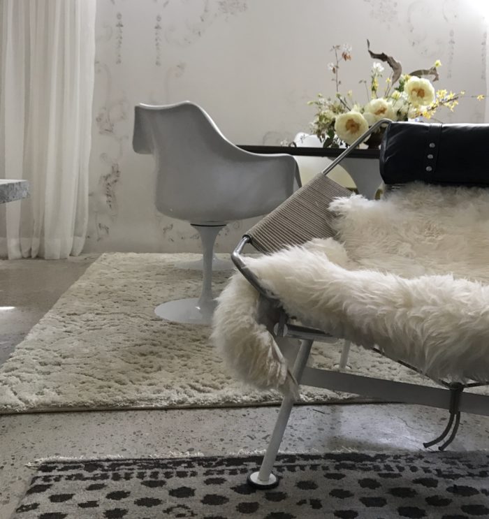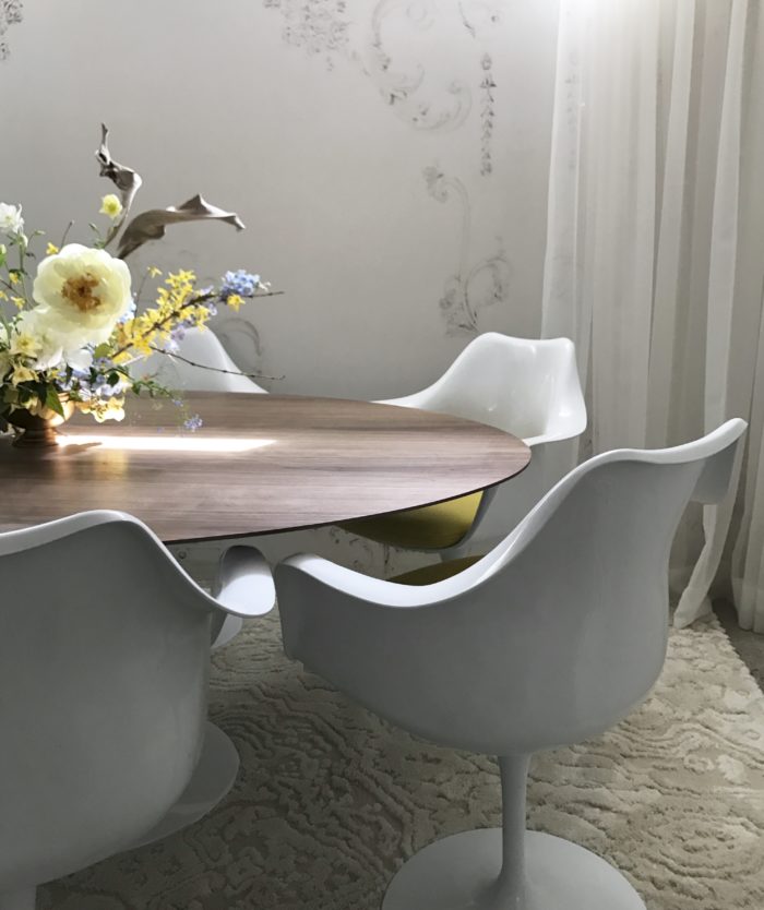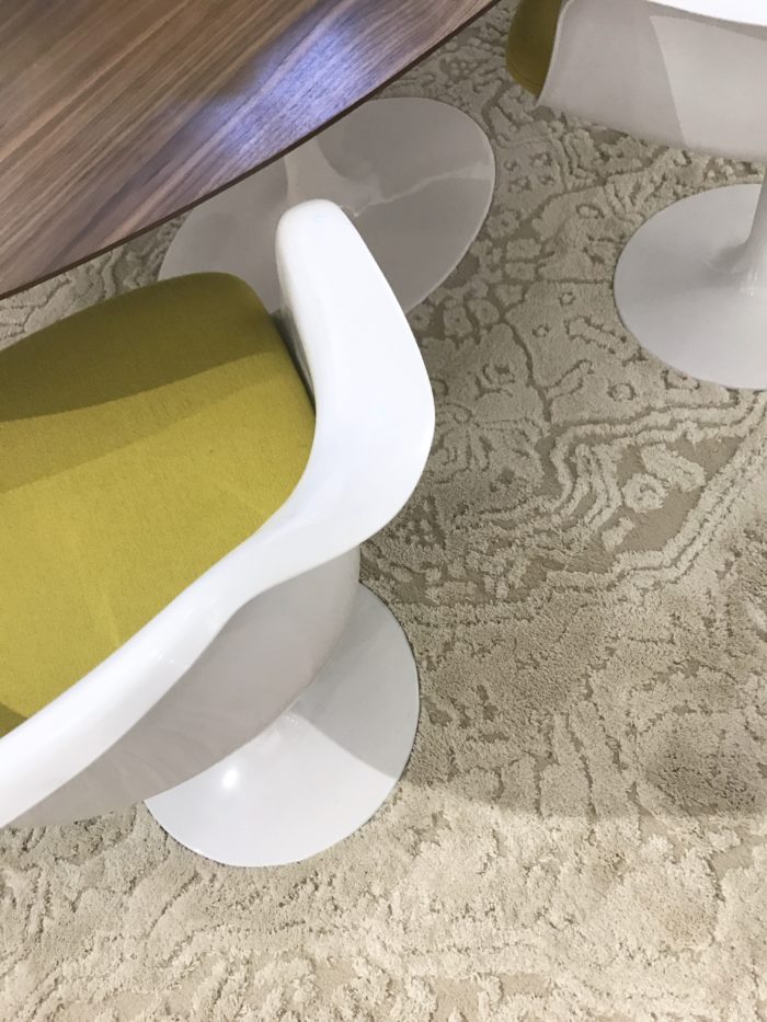 …dream Flag Halyard chair, walnut dining table and tulip dining chairs are Rove Concepts, grey carpet is Annie Selke and the beige carpet is Mohawk Home.