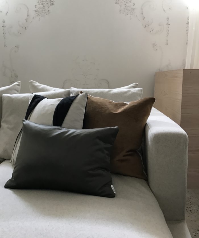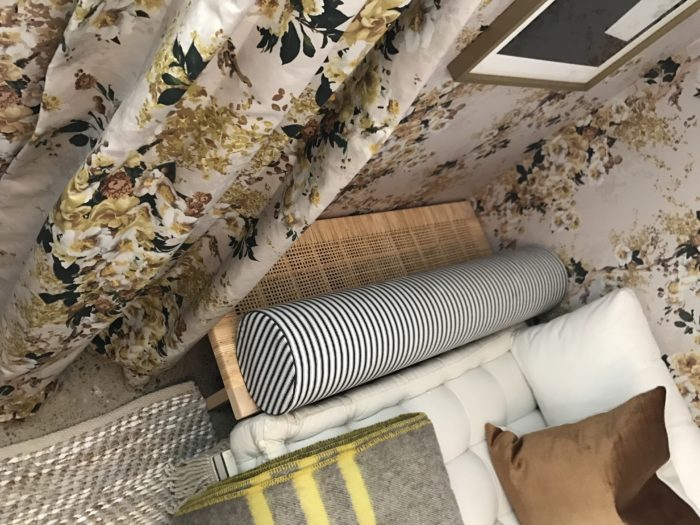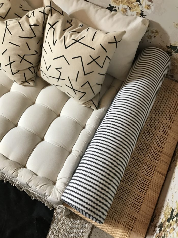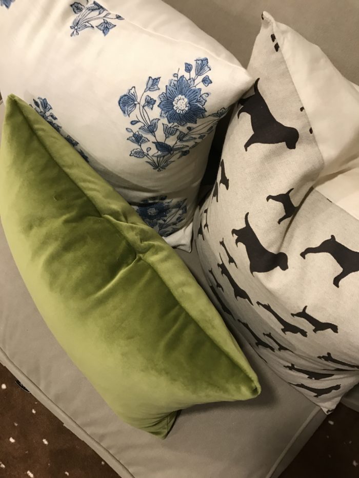 Bolster pillows and velvet pillow (fabric by Fabricut,) Hollie Cooper Interiors