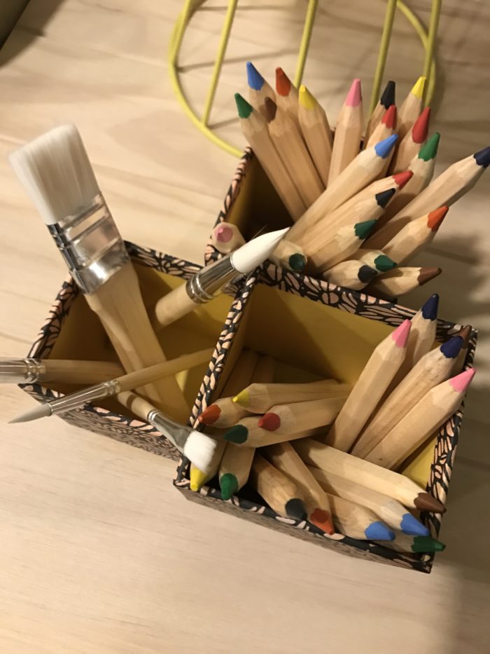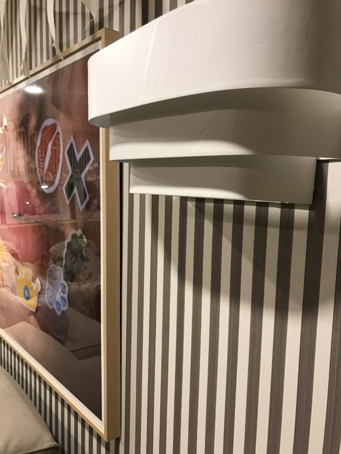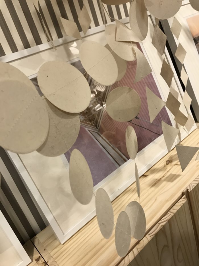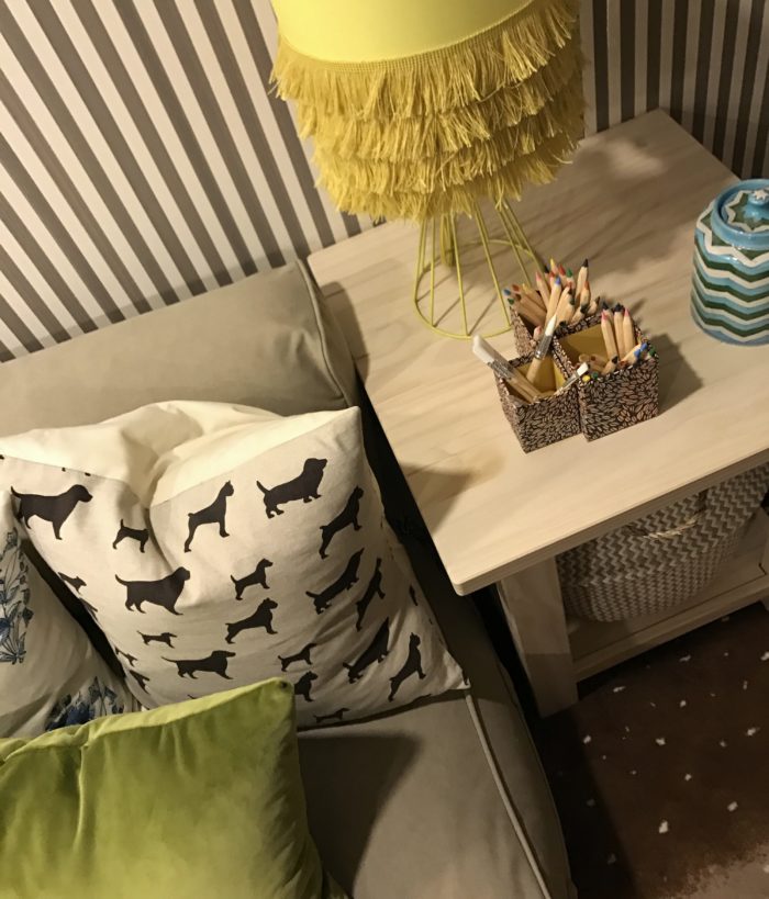Art Frames, LED display box, IVAR wood cabinets, side tables (Lisabo and Rekarne), Stockholm 2017 armchair (teddy bear chair,) paper roll, pencil crayons, crayon cups, IKEA Canada