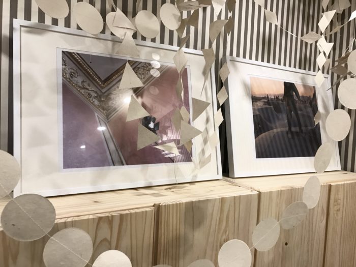 Trio of framed photographs on top of wood console, Nicole Cohen