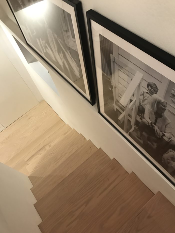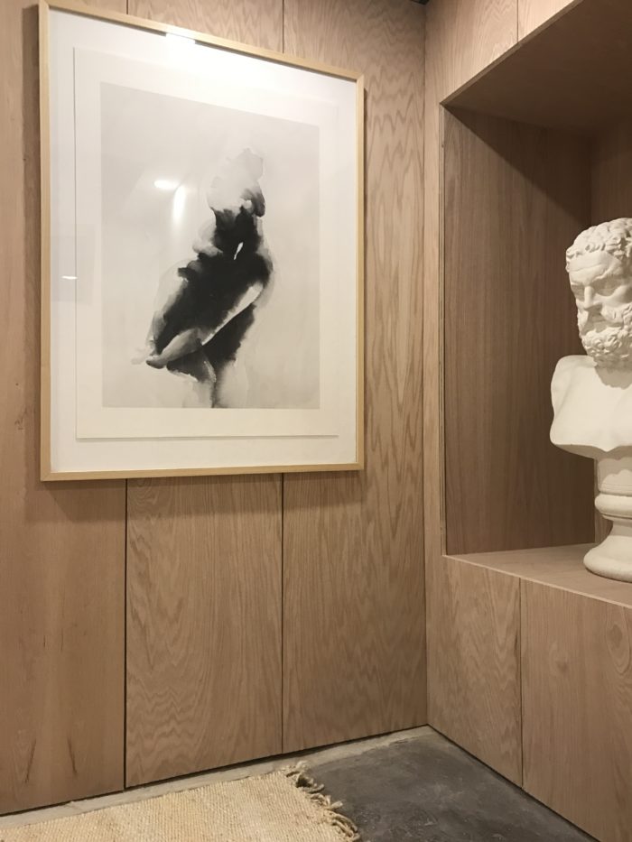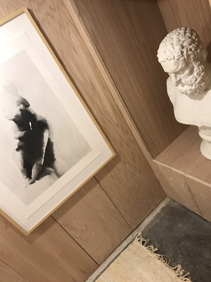 …the framed artwork is from Minted, and all the oak sheeting and supplies to make the cabinetry that runs the length of the hallway, was supplied by Home Depot Canada.