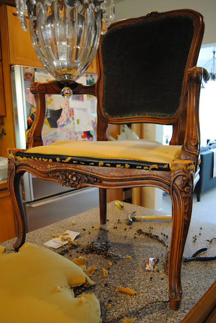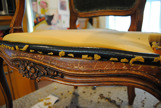 Along with decisions about how to dress the hallway, I am a little strung out on what to do with the Craigslist chairs. We started the upholstery process yesterday and let’s just say it didn’t go as well as I had hoped. Here’s the gorry details- first in picture form-