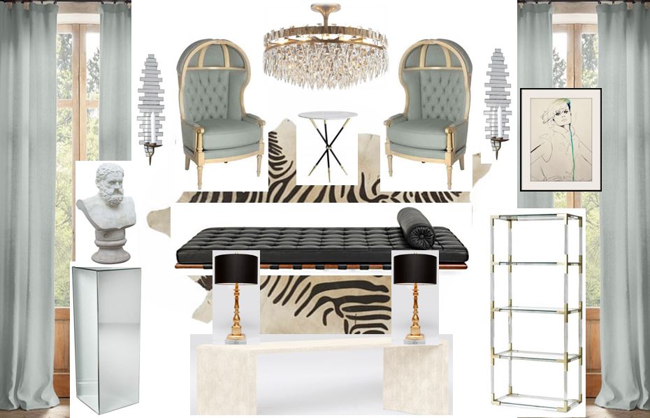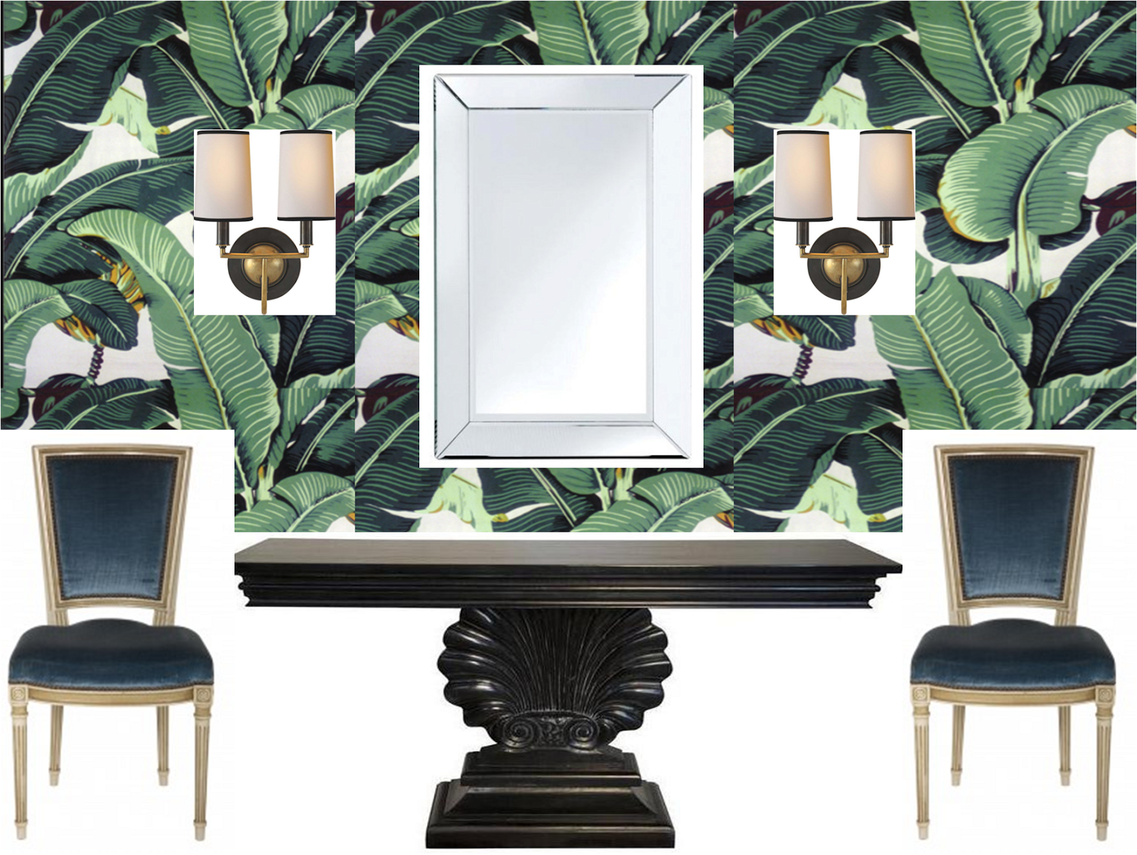 We’re considering putting the paper up in her entrance hallway and though I’m not officially working on this space, I couldn’t help but throw a quick board together to show her how adding this bold green pattern could work amazingly well with our pale blue, black, neutral scheme…