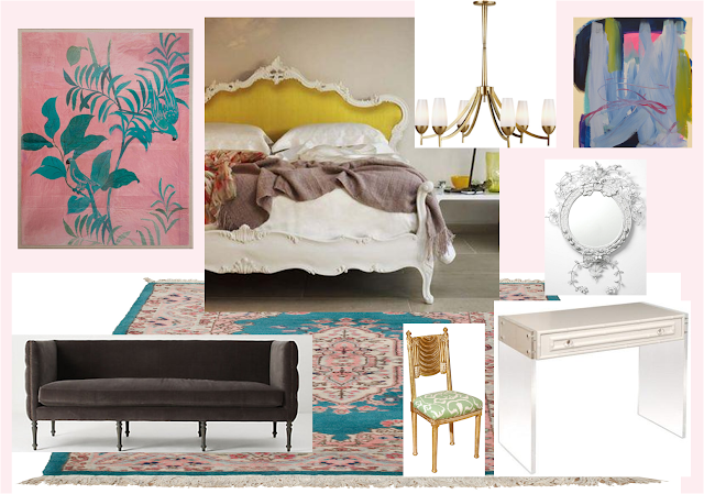 I’m dreaming of a room with that bed in yellow, pink walls and all of this (PS…please excuse the crappy old school board- I’m using my hubsters computer because I need a new charge cord and well, he’s got some primative Powerpoint that doesn’t allow me to remove backgrounds)…