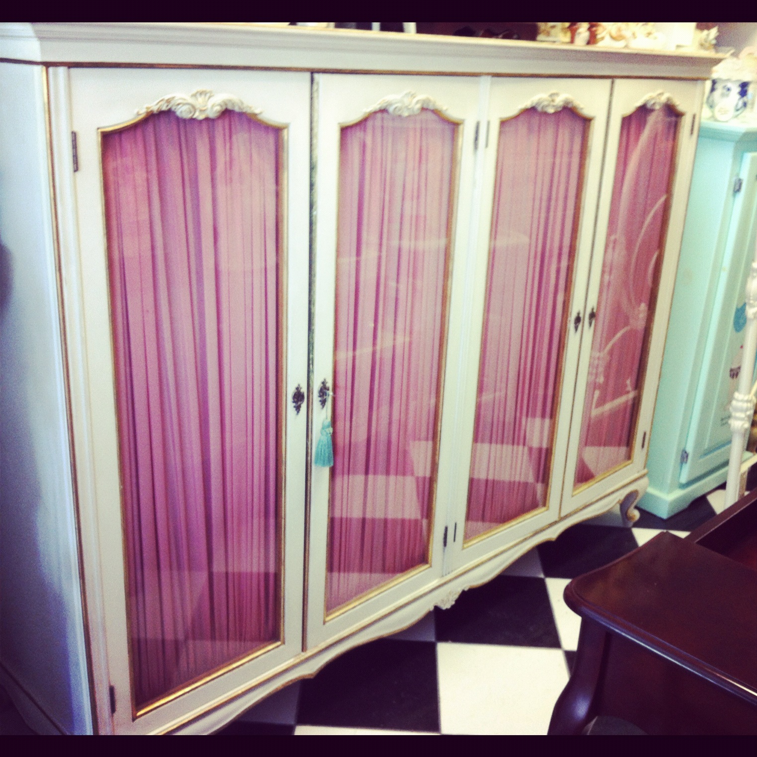 First, after hitting one of my favourite local antique haunts and taking a few pictures of vanity options for my Little Miss client, I turned the corner on my way out and spied some gold and pink hiding from behind a bed frame…upon closer inspection, this piece of total Bijou heaven was unveiled…