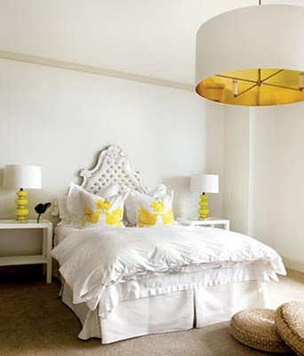 I have to say that I adore pops of yellow in a room and how great is that white tufted headboard?!